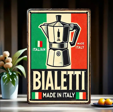 Vintage Bialetti Italian Moka Pot Metal Sign (8" x 12") - Rustic "BREWED IN ITALY" Wall Decor, Perfect for Kitchen, Cafe, Bar, Office, Garden - Retro Style with Italian Flag Colors, Easy to Hang,
